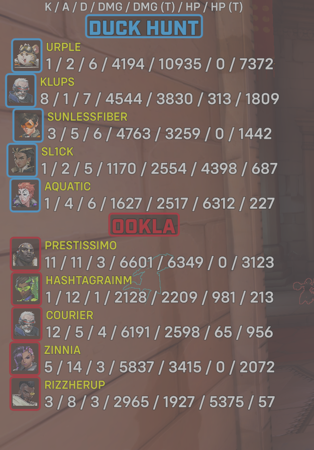 | Team | Player | Kills | Assists | Deaths | Damage | Damage (Taken) | Healing | Healing (Taken) |