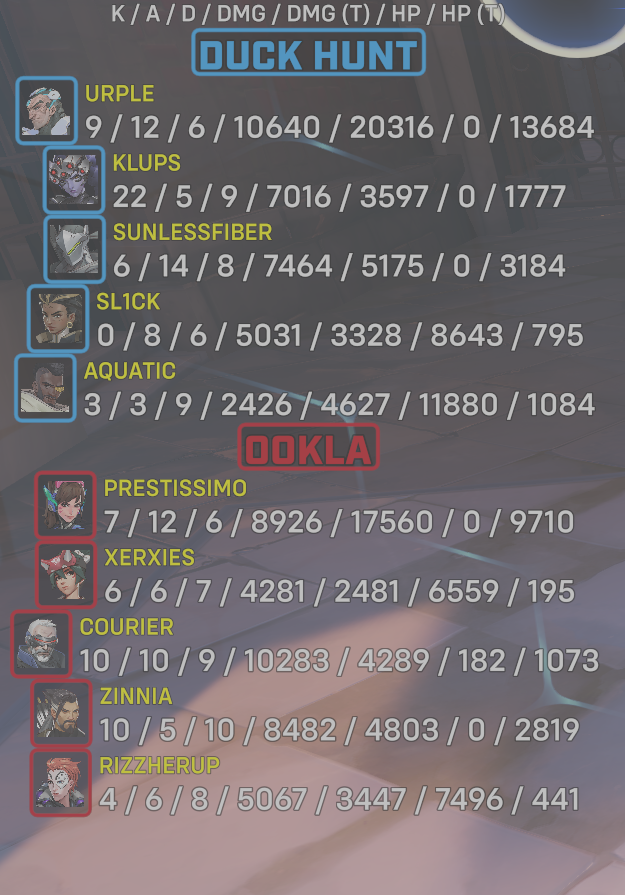 | Team | Player | Kills | Assists | Deaths | Damage | Damage (Taken) | Healing | Healing (Taken) |