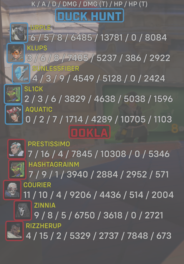 | Team | Player | Kills | Assists | Deaths | Damage | Damage (Taken) | Healing | Healing (Taken) |