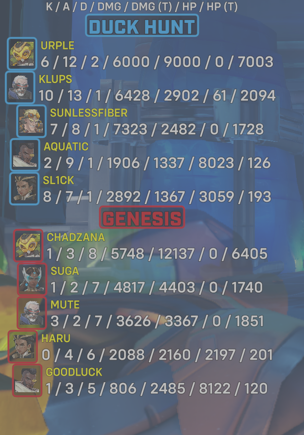 | Team | Player | Kills | Assists | Deaths | Damage | Damage (Taken) | Healing | Healing (Taken) |