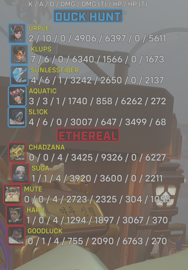 | Team | Player | Kills | Assists | Deaths | Damage | Damage (Taken) | Healing | Healing (Taken) |