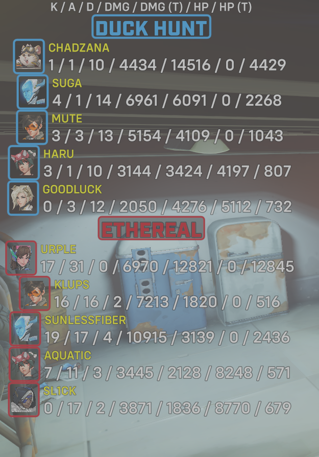 | Team | Player | Kills | Assists | Deaths | Damage | Damage (Taken) | Healing | Healing (Taken) |