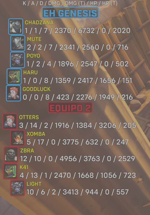 | Team | Player | Kills | Assists | Deaths | Damage | Damage (Taken) | Healing | Healing (Taken) |