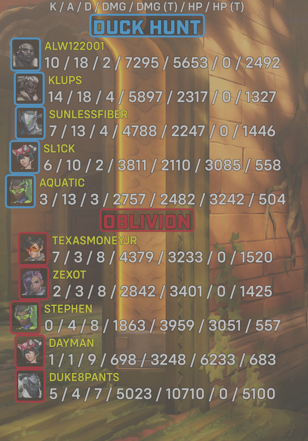| Team | Player | Kills | Assists | Deaths | Damage | Damage (Taken) | Healing | Healing (Taken) |