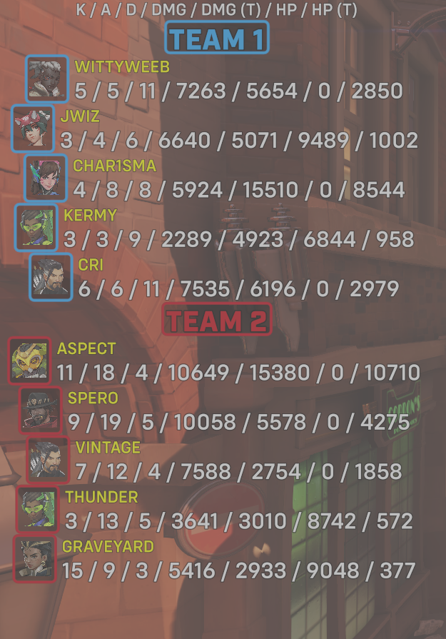 | Team | Player | Kills | Assists | Deaths | Damage | Damage (Taken) | Healing | Healing (Taken) |