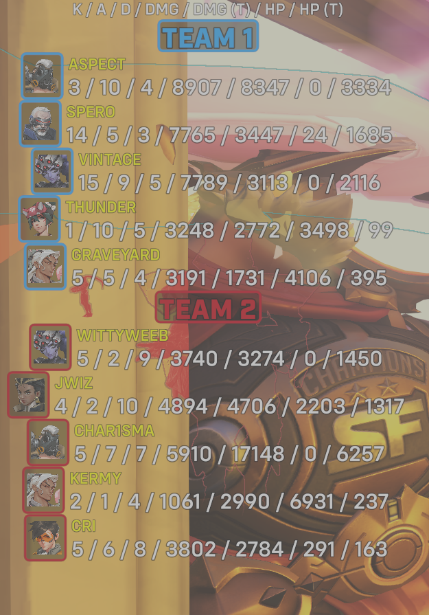 | Team | Player | Kills | Assists | Deaths | Damage | Damage (Taken) | Healing | Healing (Taken) |