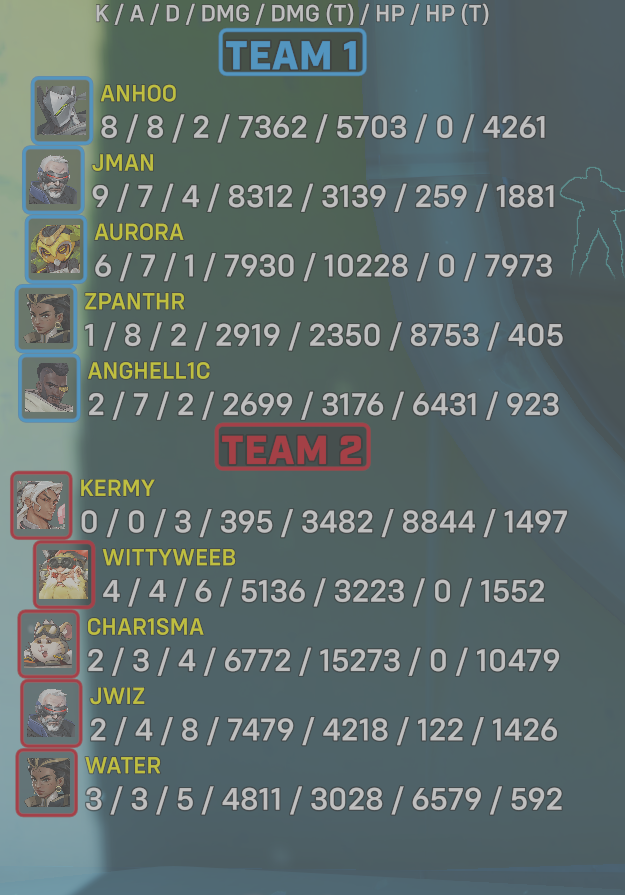 | Team | Player | Kills | Assists | Deaths | Damage | Damage (Taken) | Healing | Healing (Taken) |