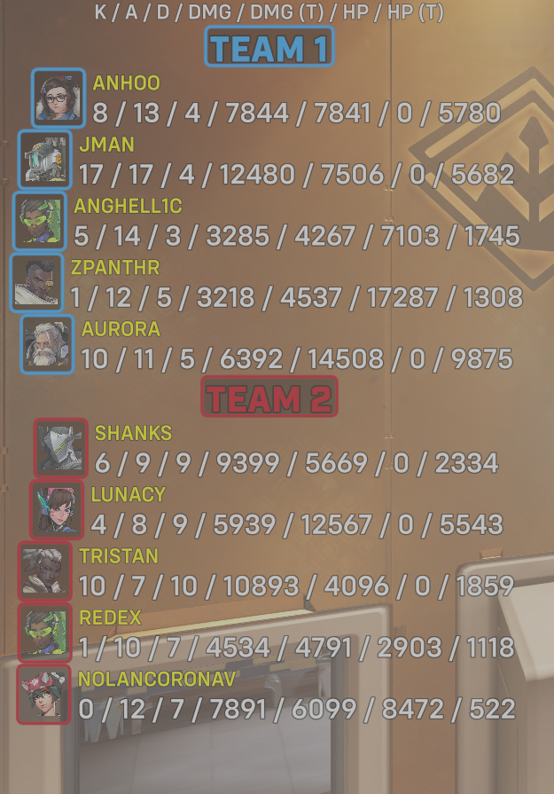 | Team | Player | Kills | Assists | Deaths | Damage | Damage (Taken) | Healing | Healing (Taken) |