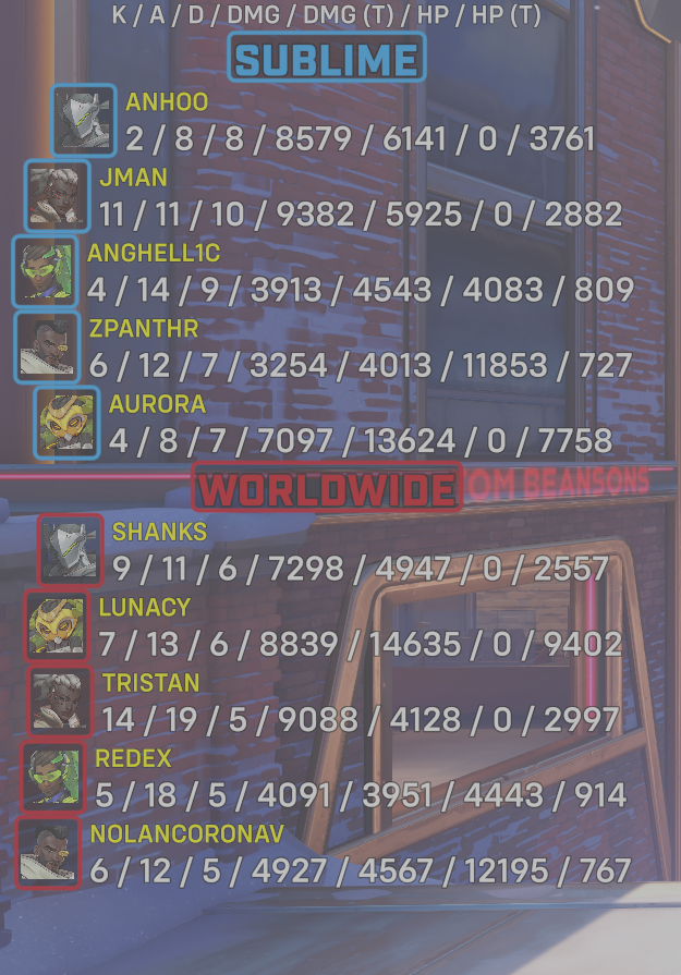 | Team | Player | Kills | Assists | Deaths | Damage | Damage (Taken) | Healing | Healing (Taken) |