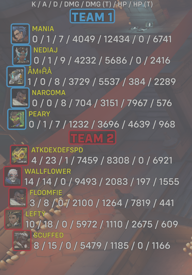 | Team | Player | Kills | Assists | Deaths | Damage | Damage (Taken) | Healing | Healing (Taken) |