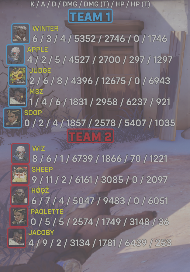 | Team | Player | Kills | Assists | Deaths | Damage | Damage (Taken) | Healing | Healing (Taken) |