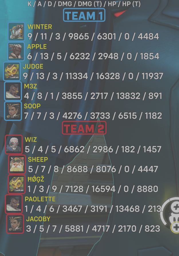 | Team | Player | Kills | Assists | Deaths | Damage | Damage (Taken) | Healing | Healing (Taken) |