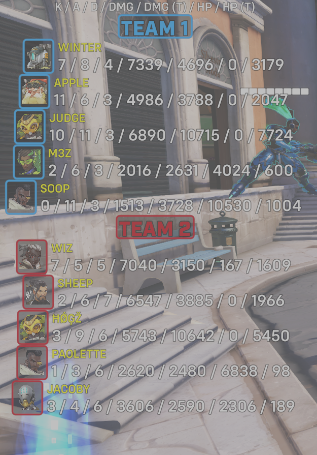 | Team | Player | Kills | Assists | Deaths | Damage | Damage (Taken) | Healing | Healing (Taken) |