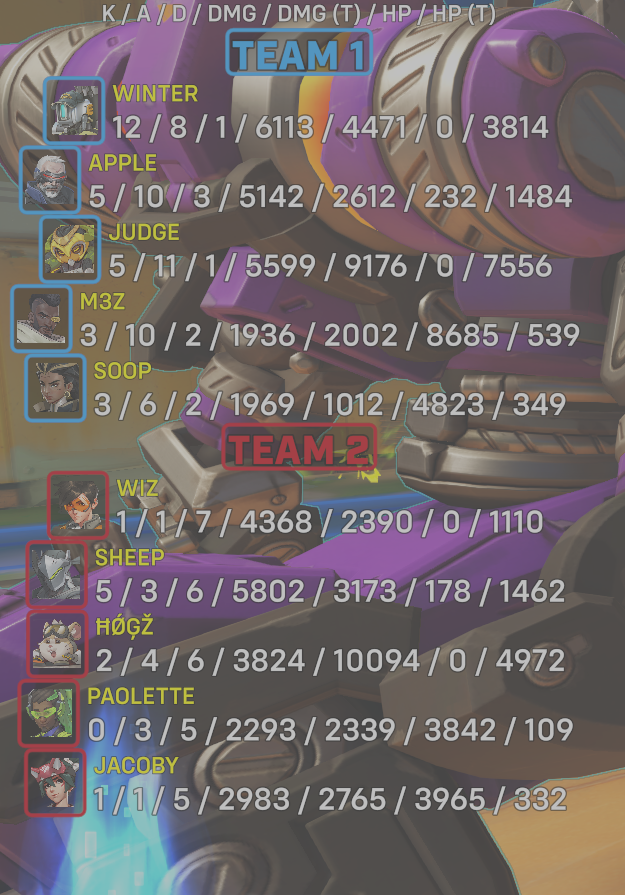 | Team | Player | Kills | Assists | Deaths | Damage | Damage (Taken) | Healing | Healing (Taken) |