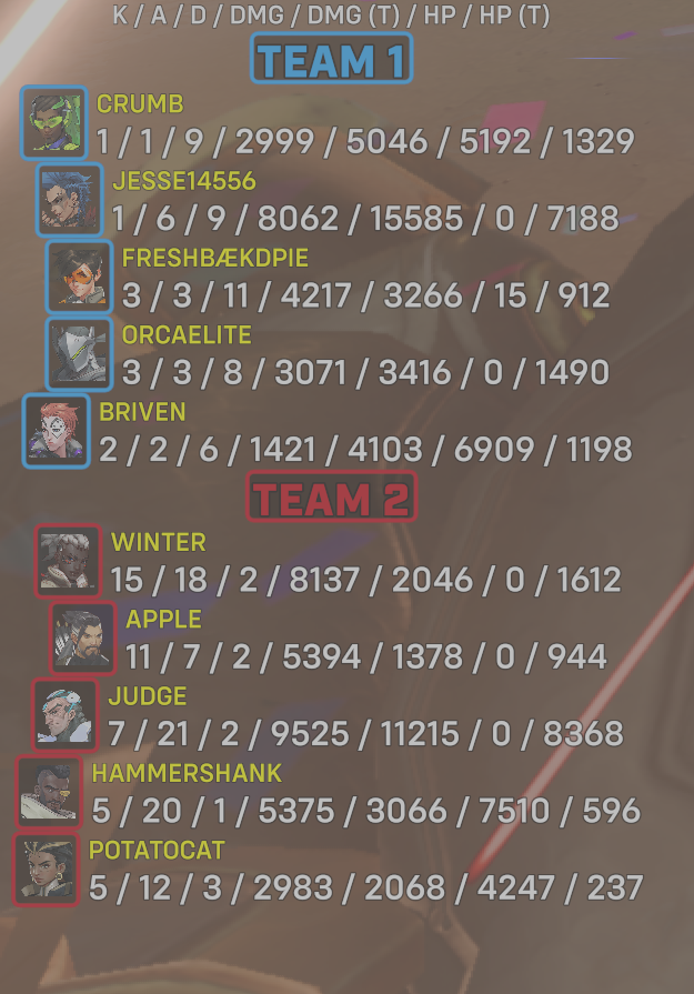 | Team | Player | Kills | Assists | Deaths | Damage | Damage (Taken) | Healing | Healing (Taken) |