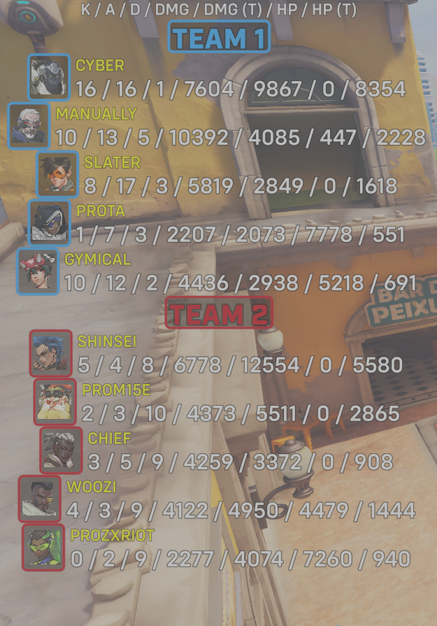 | Team | Player | Kills | Assists | Deaths | Damage | Damage (Taken) | Healing | Healing (Taken) |