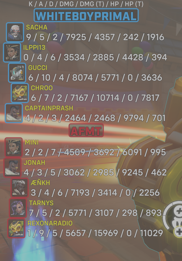 | Team | Player | Kills | Assists | Deaths | Damage | Damage (Taken) | Healing | Healing (Taken) |