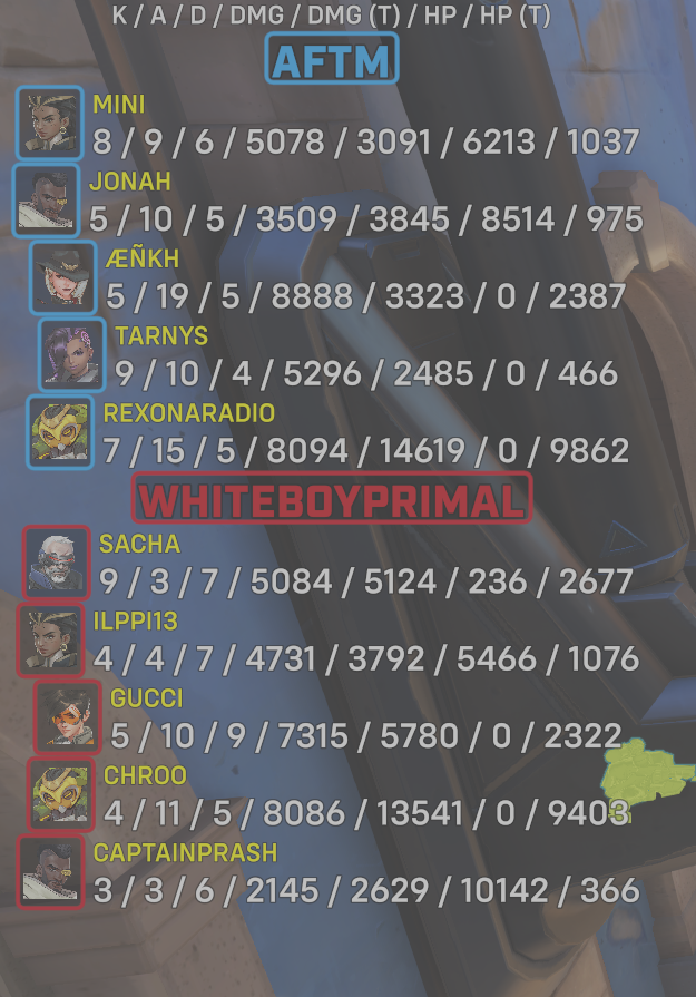 | Team | Player | Kills | Assists | Deaths | Damage | Damage (Taken) | Healing | Healing (Taken) |