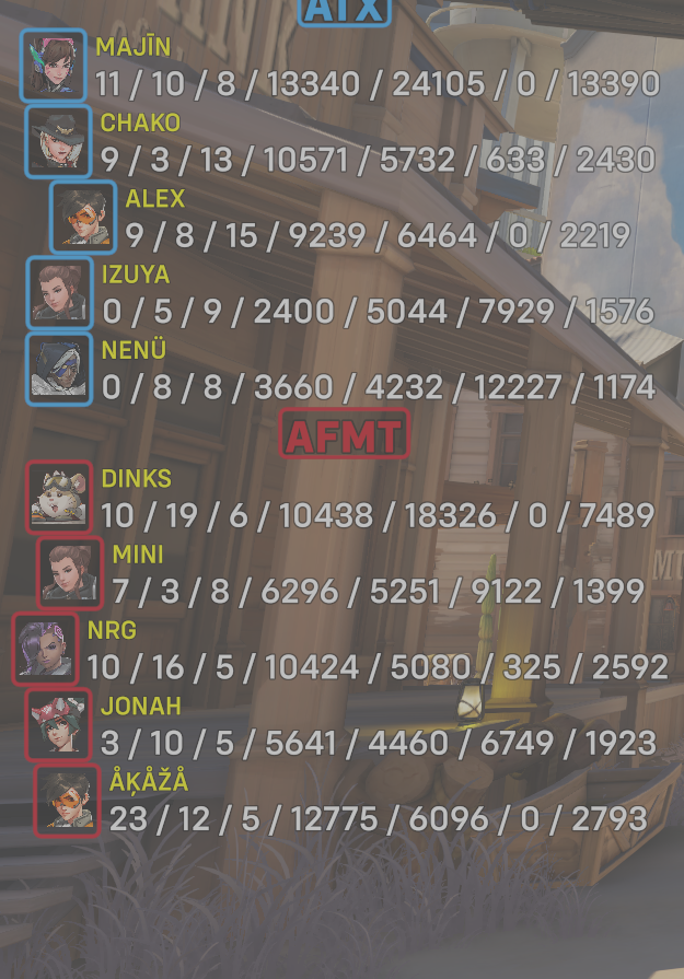 | Team | Player | Kills | Assists | Deaths | Damage | Damage (Taken) | Healing | Healing (Taken) |