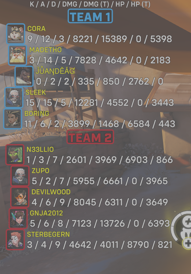| Team | Player | Kills | Assists | Deaths | Damage | Damage (Taken) | Healing | Healing (Taken) |