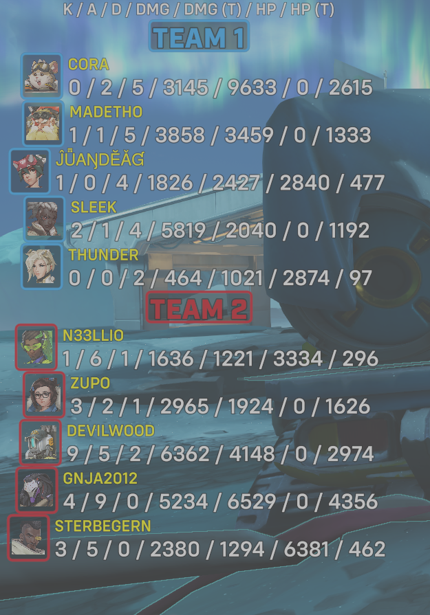| Team | Player | Kills | Assists | Deaths | Damage | Damage (Taken) | Healing | Healing (Taken) |