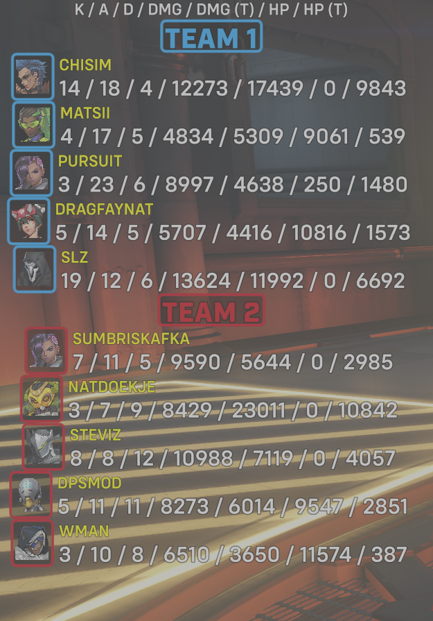 | Team | Player | Kills | Assists | Deaths | Damage | Damage (Taken) | Healing | Healing (Taken) |