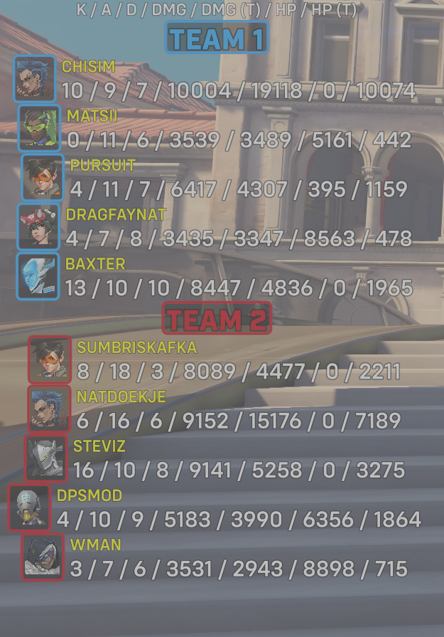 | Team | Player | Kills | Assists | Deaths | Damage | Damage (Taken) | Healing | Healing (Taken) |