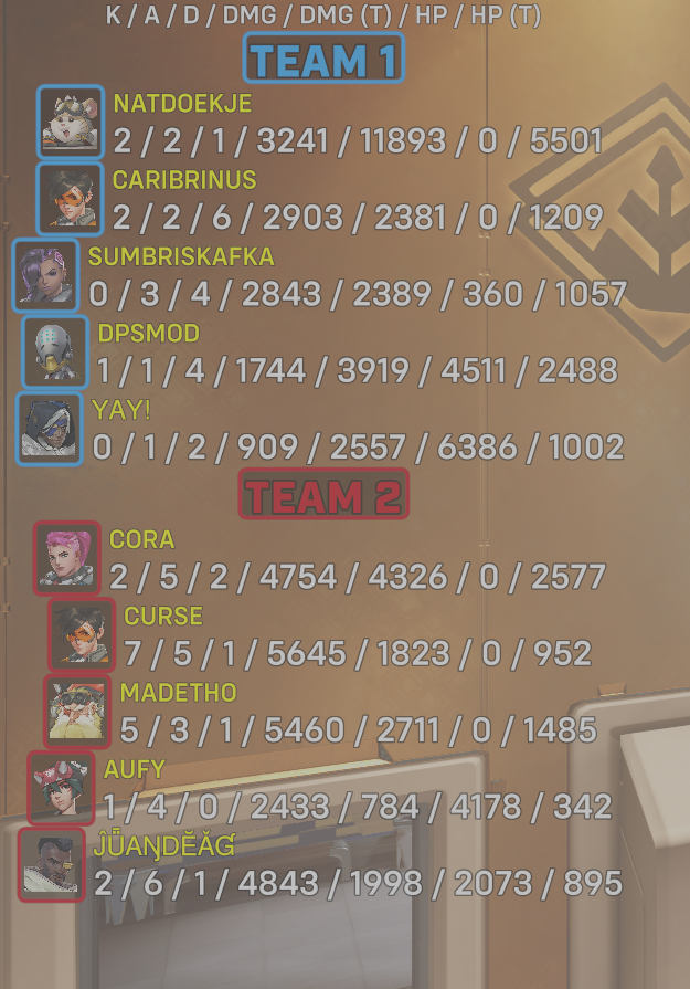 | Team | Player | Kills | Assists | Deaths | Damage | Damage (Taken) | Healing | Healing (Taken) |