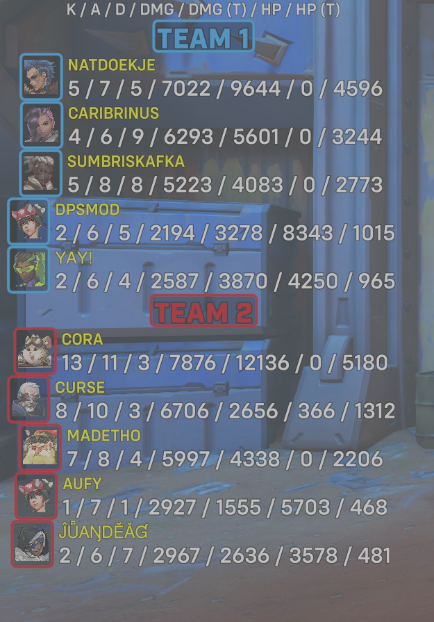 | Team | Player | Kills | Assists | Deaths | Damage | Damage (Taken) | Healing | Healing (Taken) |