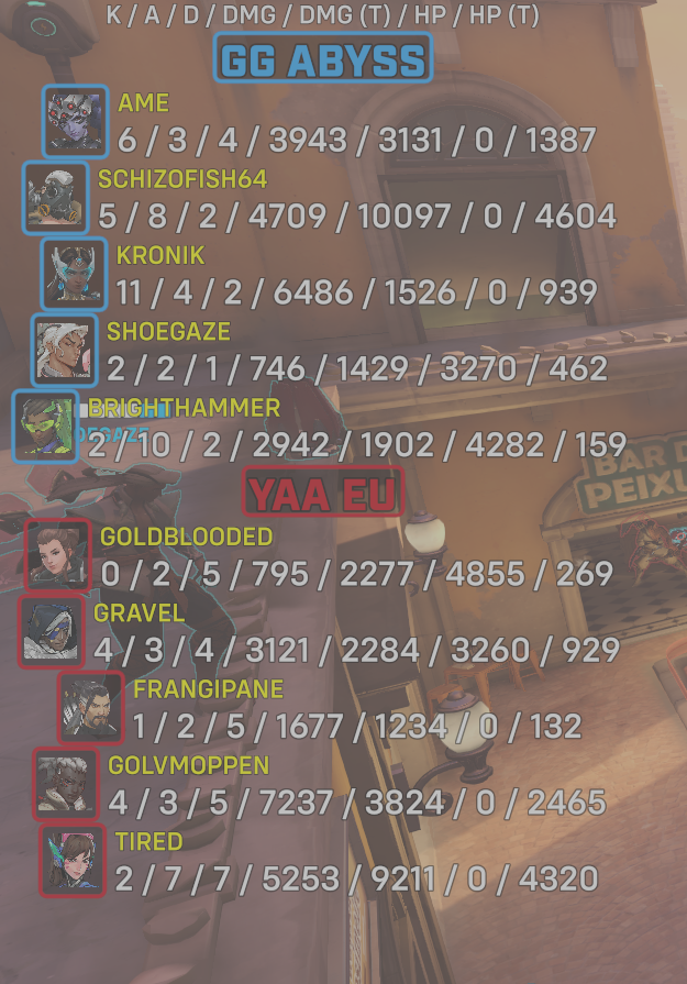 | Team | Player | Kills | Assists | Deaths | Damage | Damage (Taken) | Healing | Healing (Taken) |