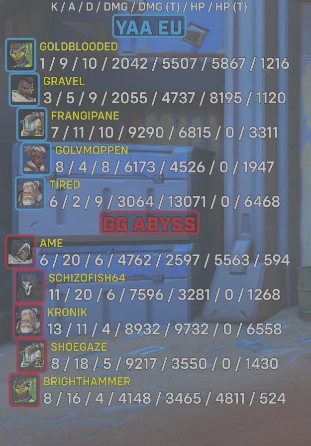 | Team | Player | Kills | Assists | Deaths | Damage | Damage (Taken) | Healing | Healing (Taken) |