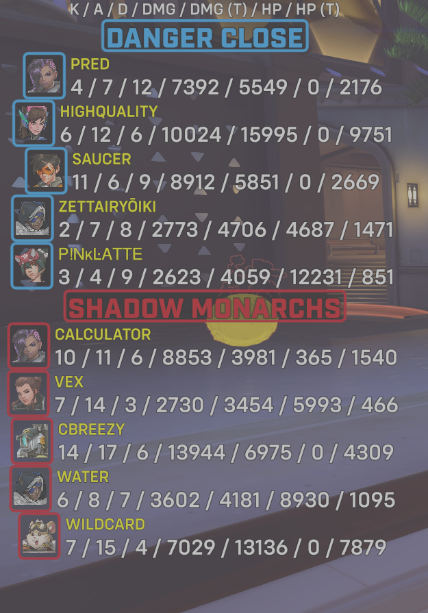 10 entries| Team | Player | Kills | Assists | Deaths | Damage | Damage (Taken) | Healing | Healing (Taken) |