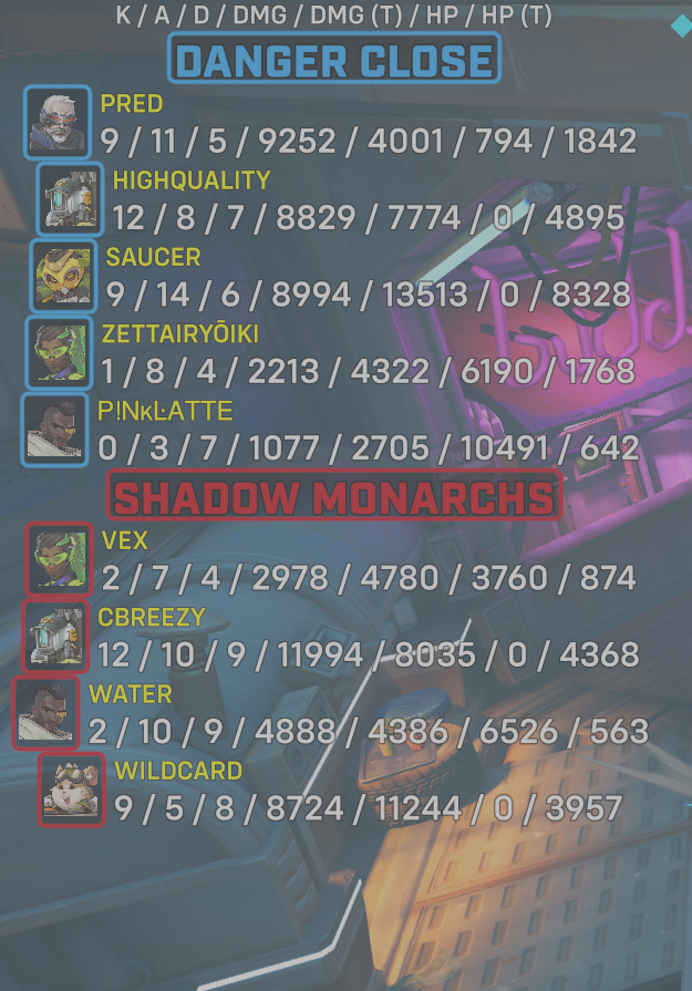 9 entries| Team | Player | Kills | Assists | Deaths | Damage | Damage (Taken) | Healing | Healing (Taken) |