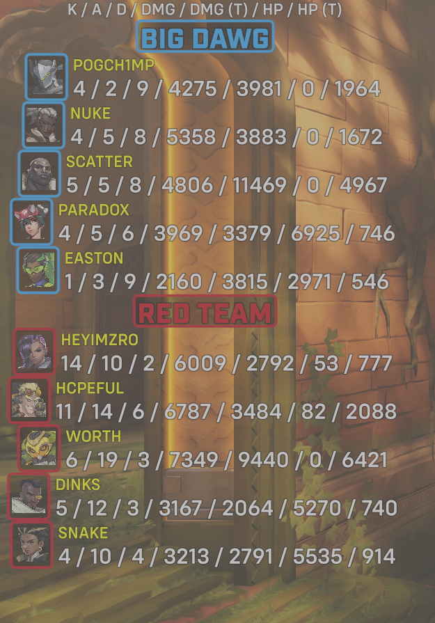 10 entries| Team | Player | Kills | Assists | Deaths | Damage | Damage (Taken) | Healing | Healing (Taken) |