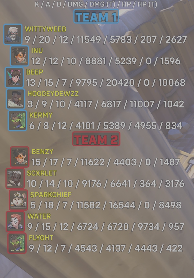 10 entries| Team | Player | Kills | Assists | Deaths | Damage | Damage (Taken) | Healing | Healing (Taken) |