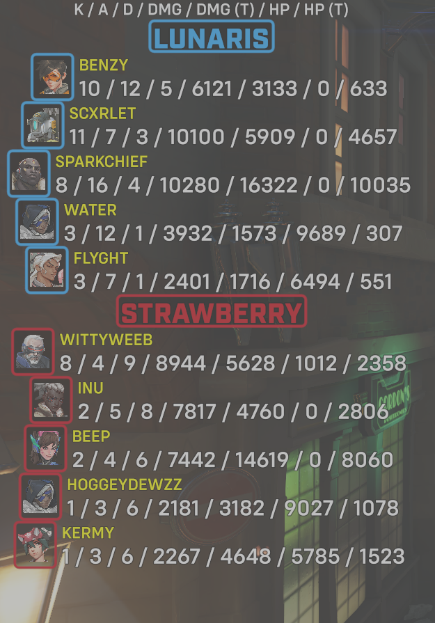 10 entries| Team | Player | Kills | Assists | Deaths | Damage | Damage (Taken) | Healing | Healing (Taken) |