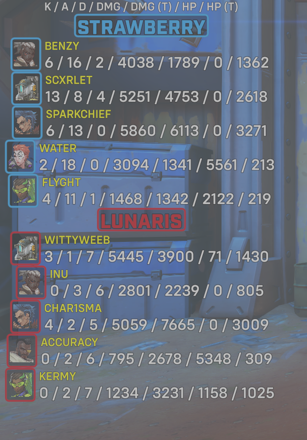 10 entries| Team | Player | Kills | Assists | Deaths | Damage | Damage (Taken) | Healing | Healing (Taken) |