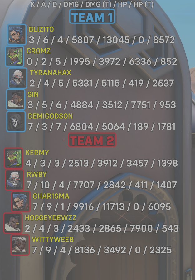 10 entries| Team | Player | Kills | Assists | Deaths | Damage | Damage (Taken) | Healing | Healing (Taken) |