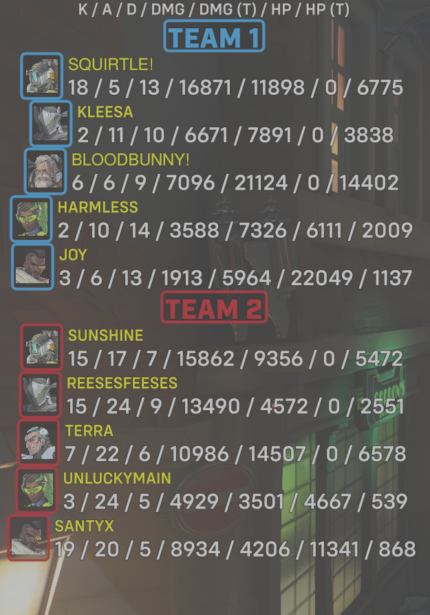 10 entries| Team | Player | Kills | Assists | Deaths | Damage | Damage (Taken) | Healing | Healing (Taken) |