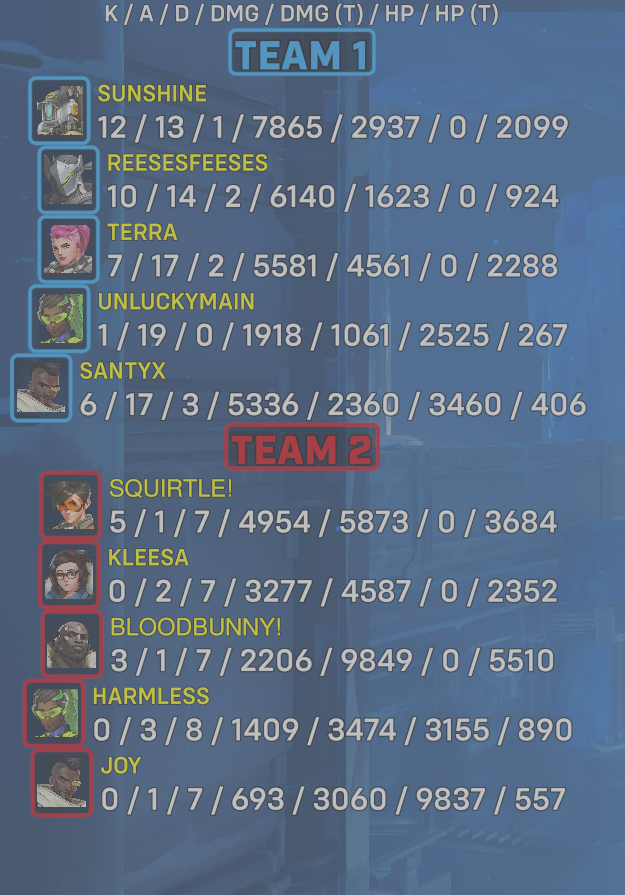 10 entries| Team | Player | Kills | Assists | Deaths | Damage | Damage (Taken) | Healing | Healing (Taken) |