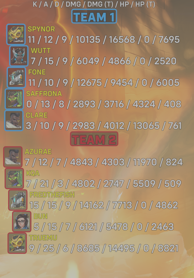 10 entries| Team | Player | Kills | Assists | Deaths | Damage | Damage (Taken) | Healing | Healing (Taken) |