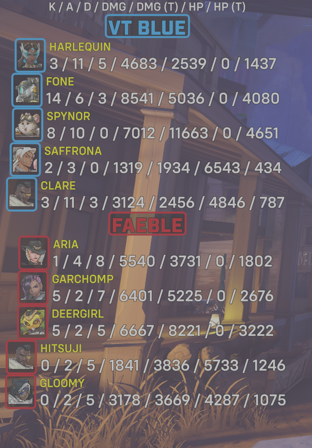 10 entries| Team | Player | Kills | Assists | Deaths | Damage | Damage (Taken) | Healing | Healing (Taken) |