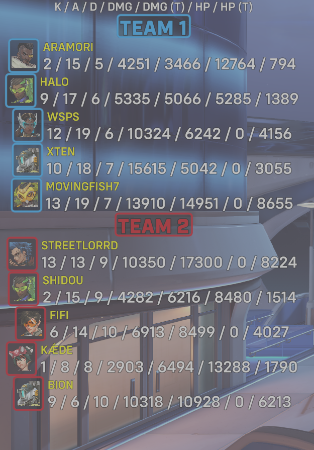 10 entries| Team | Player | Kills | Assists | Deaths | Damage | Damage (Taken) | Healing | Healing (Taken) |