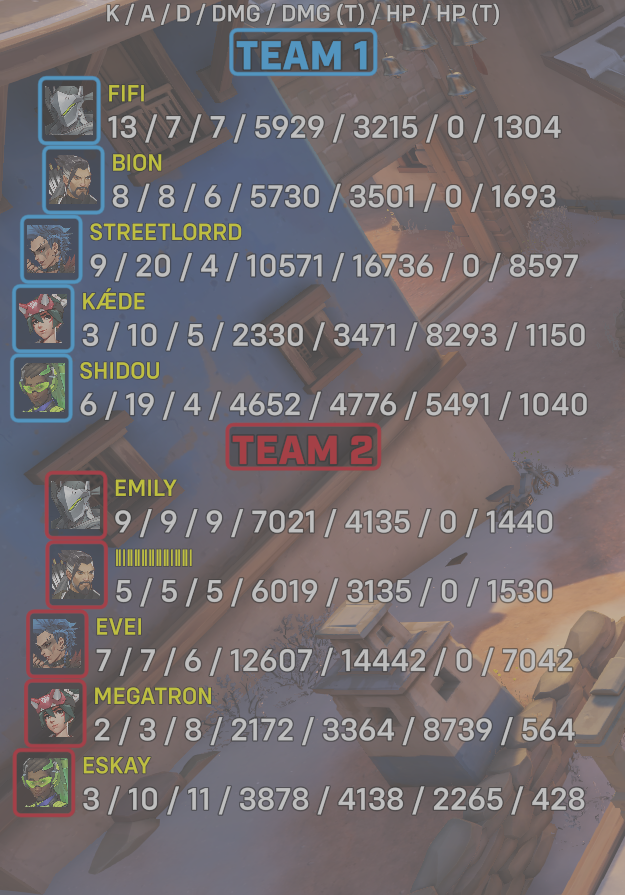 6 entries| Team | Player | Kills | Assists | Deaths | Damage | Damage (Taken) | Healing | Healing (Taken) |