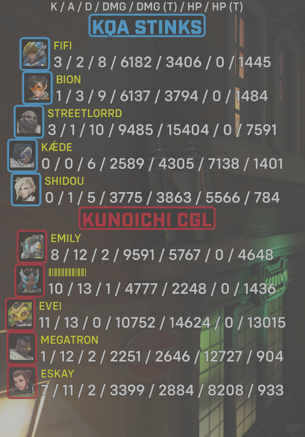 10 entries| Team | Player | Kills | Assists | Deaths | Damage | Damage (Taken) | Healing | Healing (Taken) |