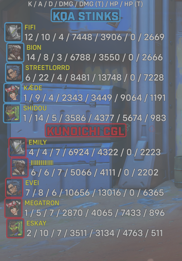6 entries| Team | Player | Kills | Assists | Deaths | Damage | Damage (Taken) | Healing | Healing (Taken) |