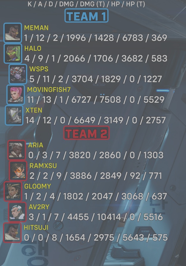 10 entries| Team | Player | Kills | Assists | Deaths | Damage | Damage (Taken) | Healing | Healing (Taken) |