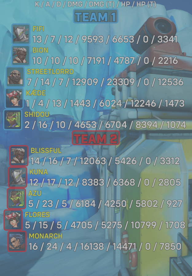 10 entries| Team | Player | Kills | Assists | Deaths | Damage | Damage (Taken) | Healing | Healing (Taken) |