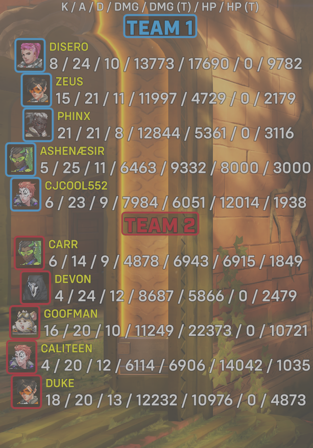 10 entries| Team | Player | Kills | Assists | Deaths | Damage | Damage (Taken) | Healing | Healing (Taken) |