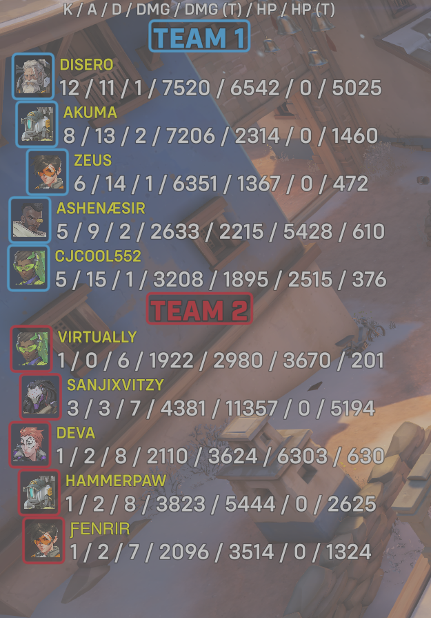 10 entries| Team | Player | Kills | Assists | Deaths | Damage | Damage (Taken) | Healing | Healing (Taken) |